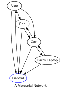 First, let's talk about exactly what distributed version control is. The most common approach to describing a decentralized system is to present the reader with an image like this one, taken from the mercurial page called UnderstandingMercurial: