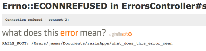 As part of our rumble project, we built plugins for both rails and merb that override their default development mode error messages. With our plugin installed, you'll see our logo below the error message. Simply click on the logo to automatically jump to a what does this error mean search!