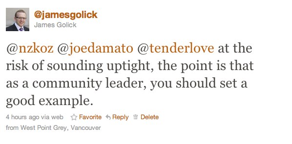 Aaron is one of a small group of people in the ruby community who actually has the power to do something about this problem. By setting the right example, people will copy and paste good code instead of bad code. That's more useful than a million tweets or blog posts.