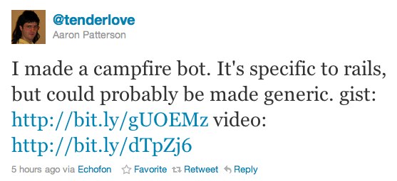 Then today, one of the biggest names in the ruby community, Aaron Patterson (aka @tenderlove), posted a gist of a little campfire bot that he wrote that forced net/https in to this insecure mode.